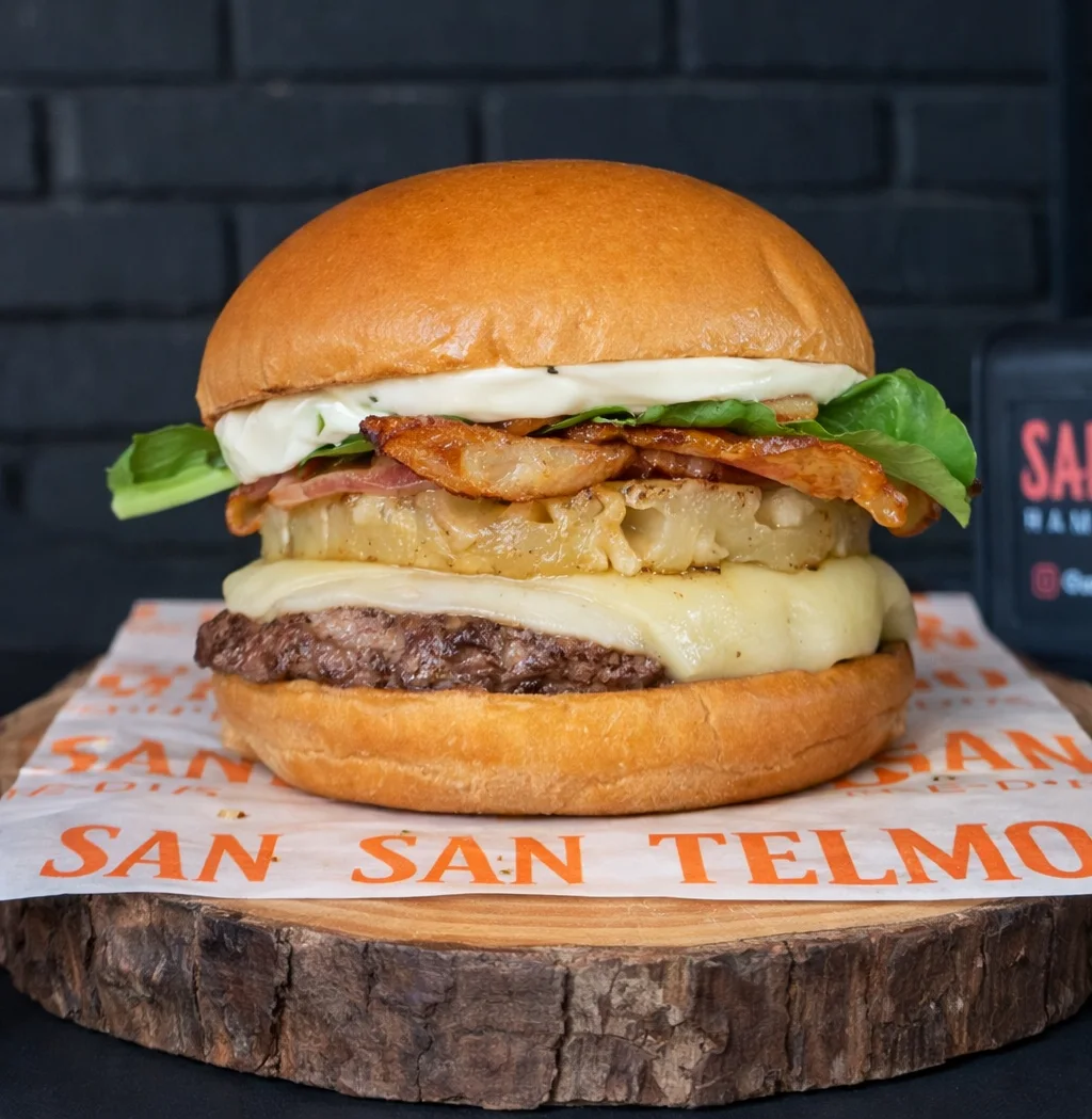 Burger 160g na brasa, queijo mussarela, abacaxi grelhado, molho sweet chilli, bacon em tiras, rúcula e maionese da casa no pão brioche. Agridoce, picante e defumado na medida certa.