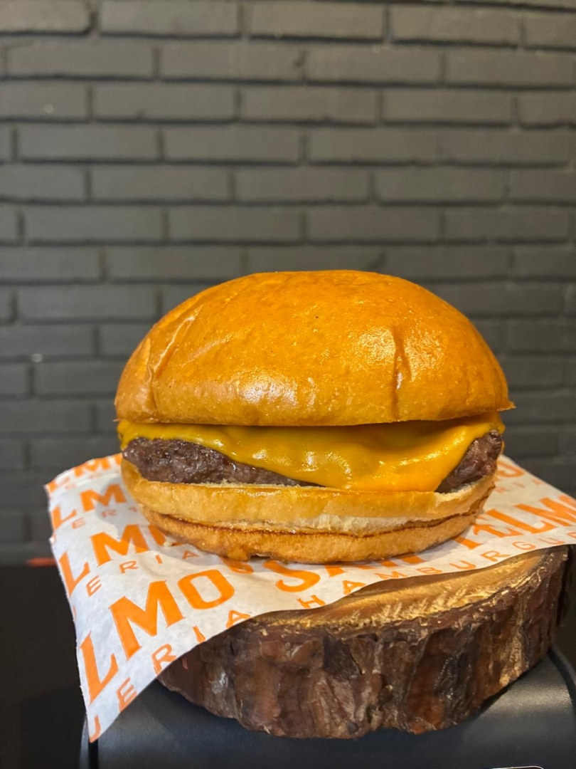 Pão brioche, hamburguer de 100g e queijo cheddar.